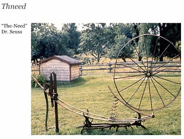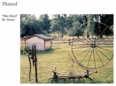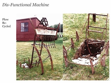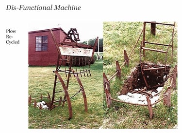 Ideas downloaded in a flow state give rise to creations that the collective consciousness genuinely needs. The concept of taking a machine apart and putting it back together is seen more dynamically in the Thneed. The curved object on the spring reminds me of desire, like when you are aiming the bow in the arrow. If you pull it back and let it go, that's the need. That's the desire that sets something into motion. My mom agrees: “Yeah, absolutely. It was very much about that. It's about putting all these parts together and making it look like it has this function that everybody needs. Like a thneed is something that everybody needs. It has multiple functions, you know. It also has that kind of movement of anticipation or participation to it.” The manure spreader my mom recycled into a treadmill also has elements of participation and circular movements. She shares, “You could run on the bottom of it, it had ball bearings and the thing would spin on top. Yeah, it had wheels on the bottom. There's some you could run on it like a treadmill and it would go in a circle.”